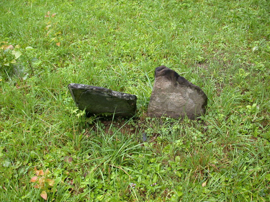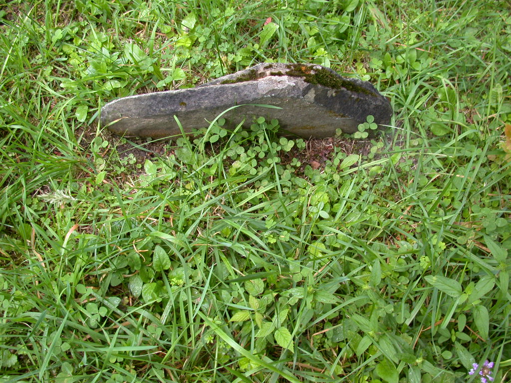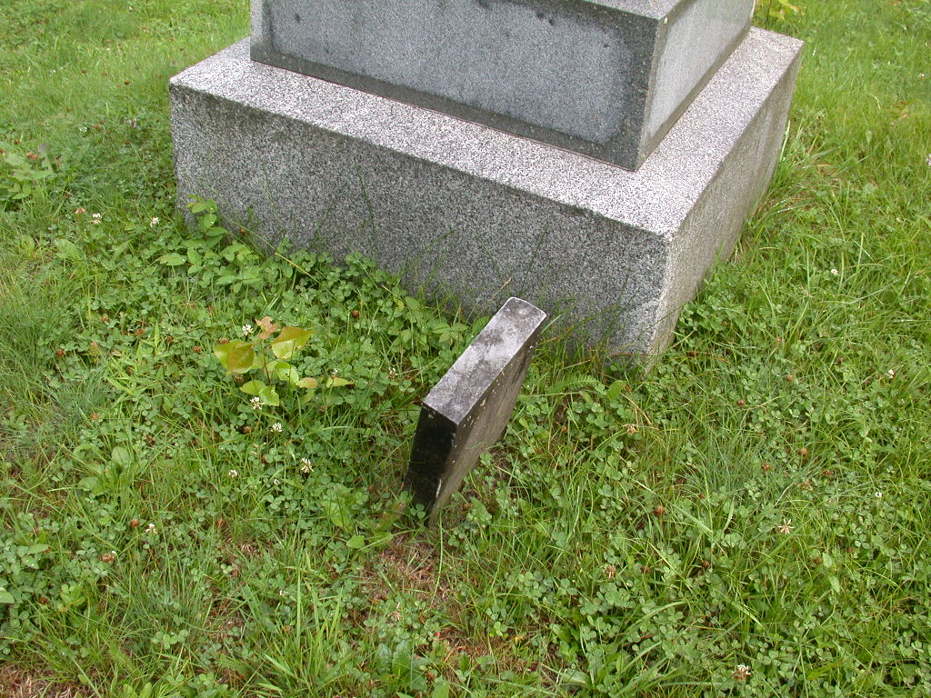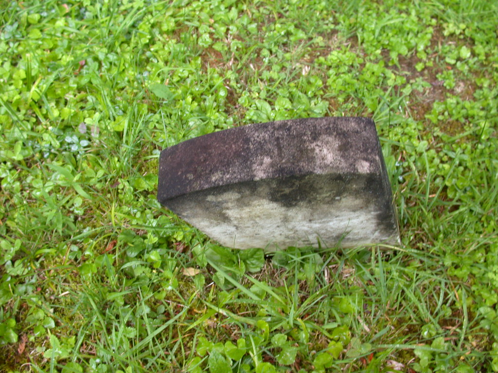 ( small footstone leaning against broken headstone -
