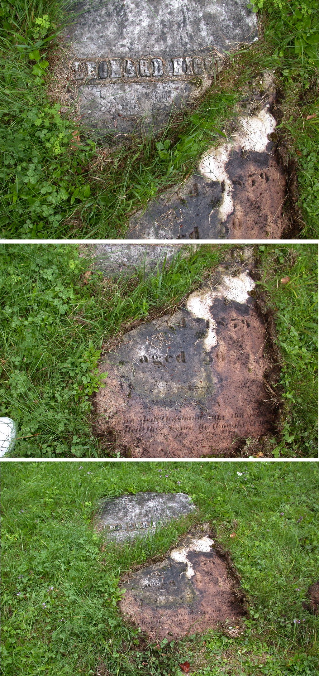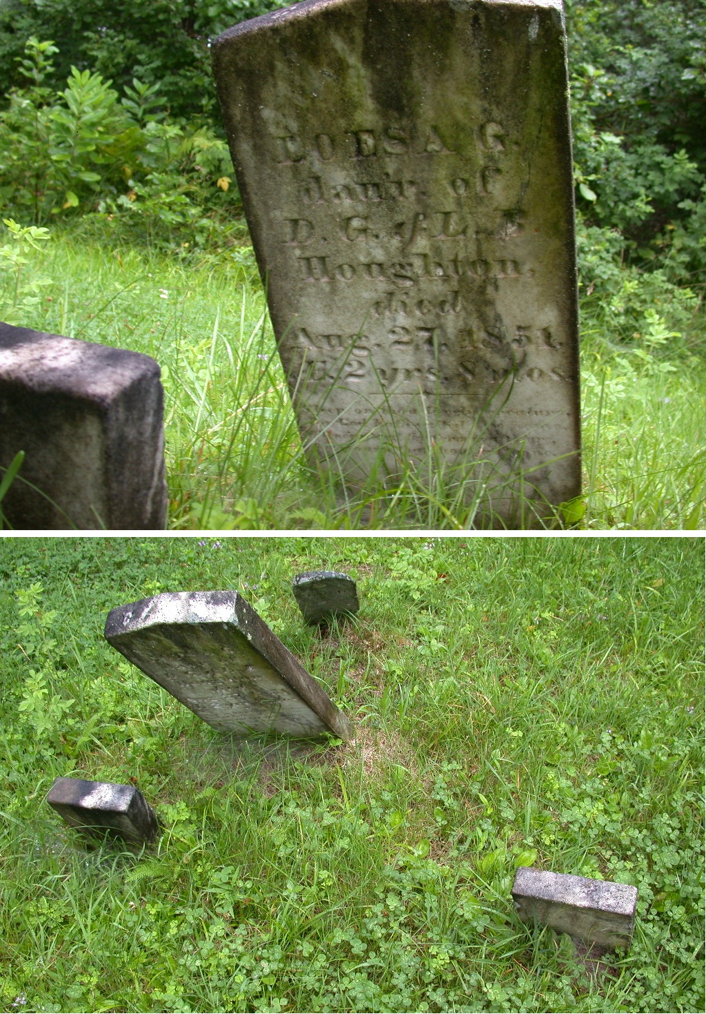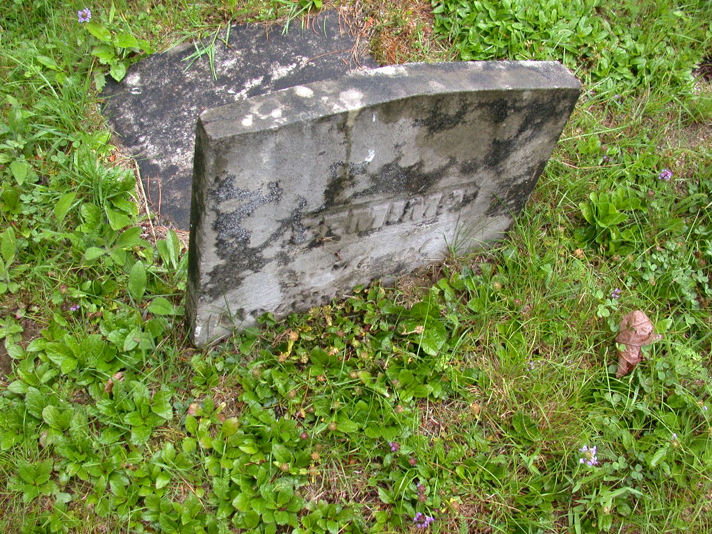 ( small footstone leaning against broken headstone -