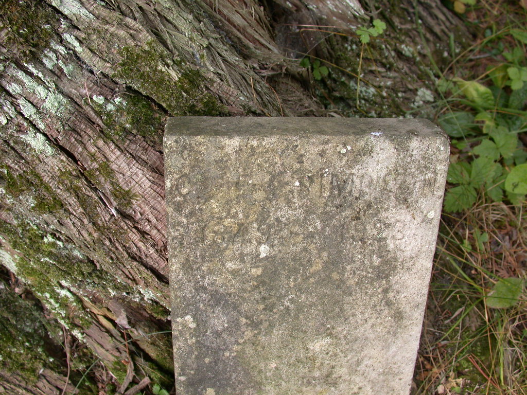 SP? ( small stone is leaning against a tree at the edge of the cemetery,